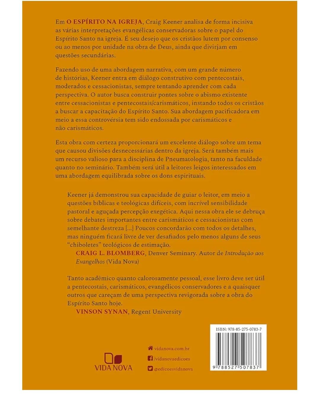 Em O Espírito na Igreja, Craig Keener apresenta uma análise profunda e abordável sobre as diferentes interpretações evangélicas conservadoras relacionadas ao Espírito Santo. Por meio de narrativas envolventes e histórias reais, Keener promove diálogos construtivos entre pentecostais, moderados e cessacionistas, encorajando um aprendizado mútuo. Esta obra não apenas explora divergências, mas também constrói pontes de unidade na obra de Deus, mesmo em questões secundárias.